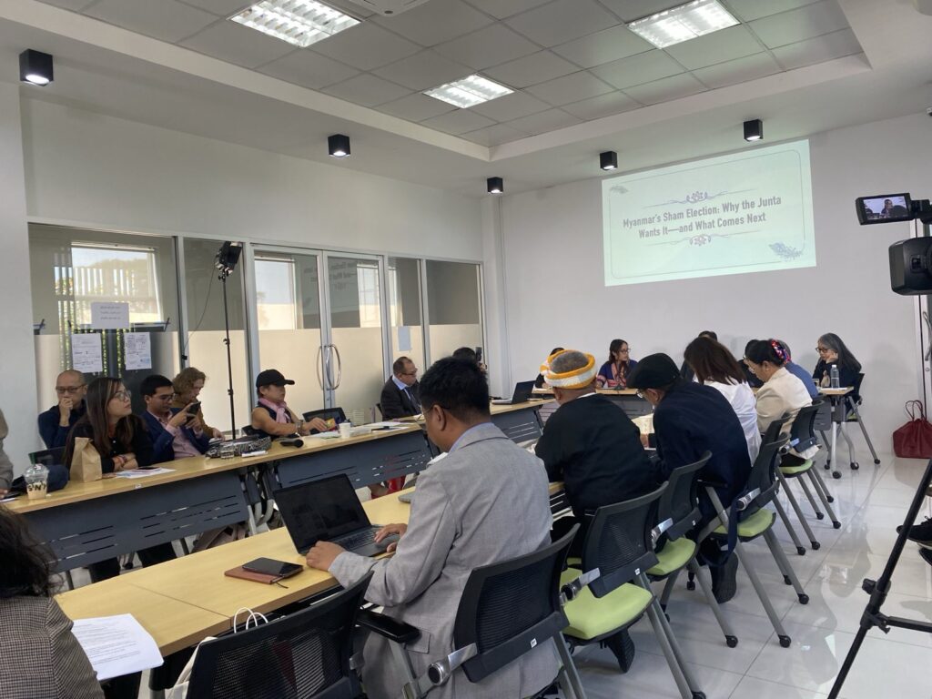 ဒီဇင်ဘာလ ၂၈ ရက်တွင် စစ်ကော်မရှင်ဘက်မှ စတင်ပြုလုပ်နေသည့် ရွေးကောက်ပွဲ ပထမပိုင်းကို ပူးပေါင်းစောင့်ကြည့်ရန် မီဒီယာများ စုဝေးပြီး ထိုင်းနိုင်ငံ ချင်းမိုင်မြို့ရှိ Thai PBS North ရုံးတွင် ပြုလုပ်လျက်ရှိသည်။