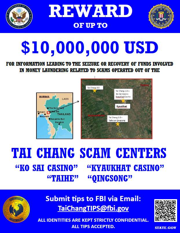 မြန်မာနိုင်ငံအတွင်း အခြေစိုက်သည့် “တိုင်းချန်” (Tai Chang) အွန်လိုင်းငွေလိမ်စင်တာများနှင့် ဆက်နွှယ်နေသော ငွေကြေးခဝါချမှုများကို ဖော်ထုတ်နိုင်ရန် သတင်းပေးနိုင်သူအား အမေရိကန်ဒေါ်လာ ၁၀ သန်းအထိ ဆုကြေးပေးမည်ဖြစ်ကြောင်း အမေရိကန်နိုင်ငံခြားရေးဝန်ကြီးဌာနအောက်ရှိ နိုင်ငံတကာ မူးယစ်ဆေးဝါးနှင့် ဥပဒေစိုးမိုးရေးဆိုင်ရာ ဗျူရို (INL) က ထုတ်ပြန်ကြေညာသည်။