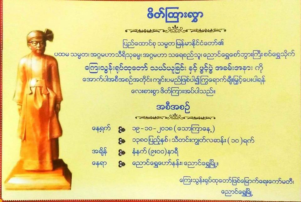 သျှမ်းပြည်တောင်ပိုင်း ညောင်ရွှေစော်ဘွားကြီးစဝ်ရွှေသိုက်၏ ကြေးသွန်းရုပ်ထု သယ်ယူခြင်းနှင့် ဖွင့်ပွဲအခမ်းအနားကို အောက်တိုဘာလ ၁၉ ရက်နေ့တွင် ကျင်းပပြုလုပ်မည်ဖြစ်ကြောင်း သိရသည်။